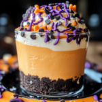 Spoon crushed Oreo cookies into each serving glass as the bottom layer. Next, pipe alternate layers of orange and purple cheesecake filling into each glass. Top it all off with whipped cream and colorful sprinkles—it’s starting to look like Halloween magic!